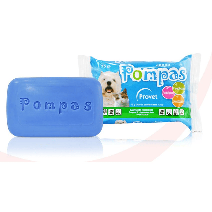 Jabon Pompas Insecticida Antiseptico Desodorante Perros Gatos 75G|Insecticida y antiséptico|Jabón que combina acción insecticida contra pulgas y garrapatas con propiedades antisépticas y desodorantes.|Baño insecticida y desodorante para perros y gatos, con cuidado de la piel.|Aplicación tópica. Masajear sobre el pelaje húmedo y enjuagar. Repetir según necesidad.|Jabón en barra de 75 g|Evitar contacto con ojos y mucosas. No usar en animales con heridas extensas.